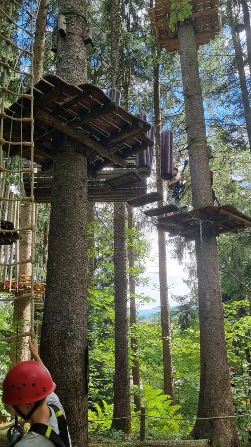 Gemeinsam haben wir unterschiedliche Parcours ausprobiert, mal wackelig, mal hoch oben in den Bäumen, und dabei jede Menge Spass gehabt. An einigen Stellen mussten die Jugendlichen sogar zu zweit eine Passage meistern: Teamwork, Mut und gegenseitige Hilfe waren gefragt. Die bunt gemischte Gruppe hat sich super ergänzt und alle haben die Herausforderungen mit Bravour gemeistert.
